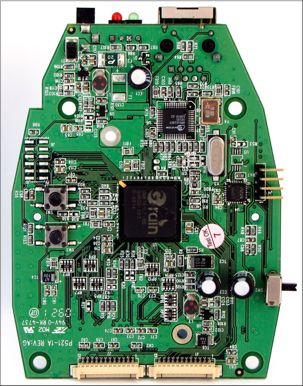 Самый большой чип на плате — это GM8161LF-BE. Так как нас до сих пор не забанили на google.com, спрашиваем там об этом чипе. Информации крайне мало, удается выяснить только то, что чип этот относится к семейству SoC (System-on-Chip), оснащен аппаратным кодеком H.264 и работает на частоте 333 МГц. Немного, но достаточно, чтобы предположить, что в качестве операционной системы в камере используется нечто линуксоподобное. Меньших размеров чип именуется DM9161BEP и представляет собой контроллер сетевого интерфейса. И самый маленький чип на этой стороне — WM 8731LS — это экономичный высококачественный аудиоконтроллер. Перевернем плату: