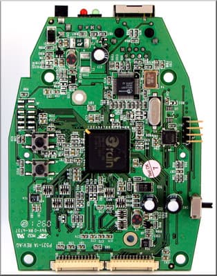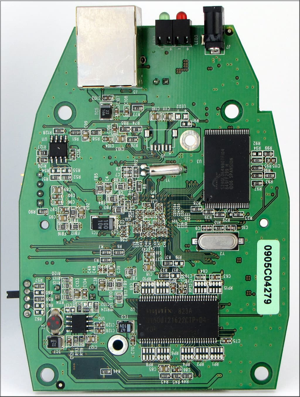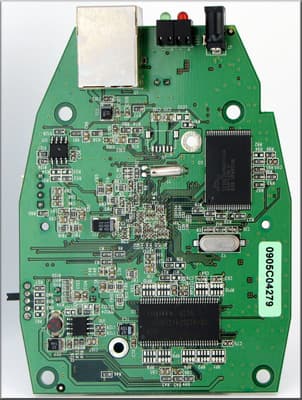 На этой стороне видим два чипа, по внешнему виду напоминающие модули памяти. Снова идем на поклон к google.com, и выясняем, что это действительно модули памяти. Первый именуется S29GL064 и представляет собой модуль флеш-памяти объемом 8 мб. А второй — это HY5DU1216222, DDR1 модуль памяти объемом 512 Мб.