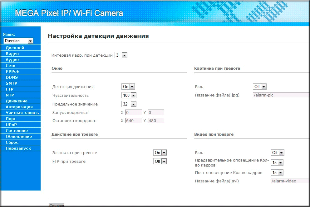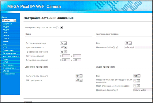 На этом пункте меню мы решили переключить язык интерфейса на русский. Как видно, перевод одного из самых сложных пунктов меню выполнен вполне адекватно. Что же касается детектора — то в нем есть все необходимое, но зону детекции можно задать всего одну. Впрочем, чаще всего одной и достаточно.