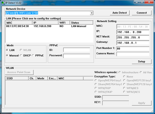 Начнем с процесса подключения камеры. Благодаря идущей в комплекте утилите под названием «IPCamSetup» процесс подключения к Grand IP Mеgapixel Camera прост до безобразия. Запускаем утилиту, выбираем сетевой интерфейс своего ПК, жмём «Auto Detect», и — voila: