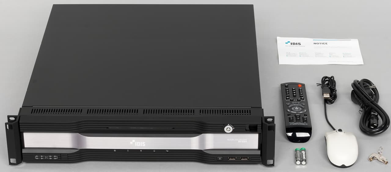 В данном случае в коробке вы найдете: кабель питания, ключи для открытия корпуса, проводную мышку, ИК-пульт дистанционного управления с батарейками и листовку с информацией об Интернет-ресурсах производителя, где можно будет найти полную электронную документацию о видеорегистраторе и получить техническую поддержку. Обратим внимание, что вам, могут потребоваться направляющие или полка для установки в стойку в случае такого варианта инсталляции.