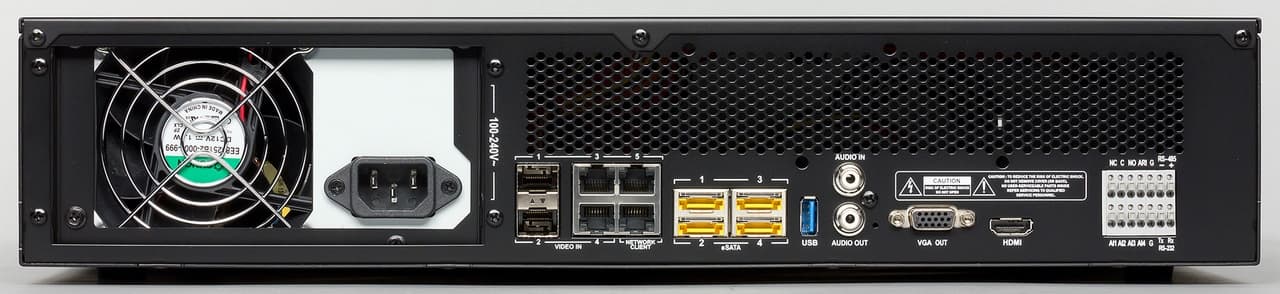 Ключевые порты и разъемы находятся на задней панели. Здесь мы видим решетку вентилятора блока питания, стандартный вход кабеля питания, два порта для сетевых модулей SFP, четыре гигабитных сетевых порта (три для камер, один для подключения в сеть предприятия), четыре порта eSATA, порт USB 3.0, аналоговые вход и выход для звука, выходы VGA и HDMI для мониторов, колодку для цифровых входов/выходов тревоги и дополнительных последовательных интерфейсов. Также здесь расположена скрытая кнопка сброса настроек видеорегистратора.