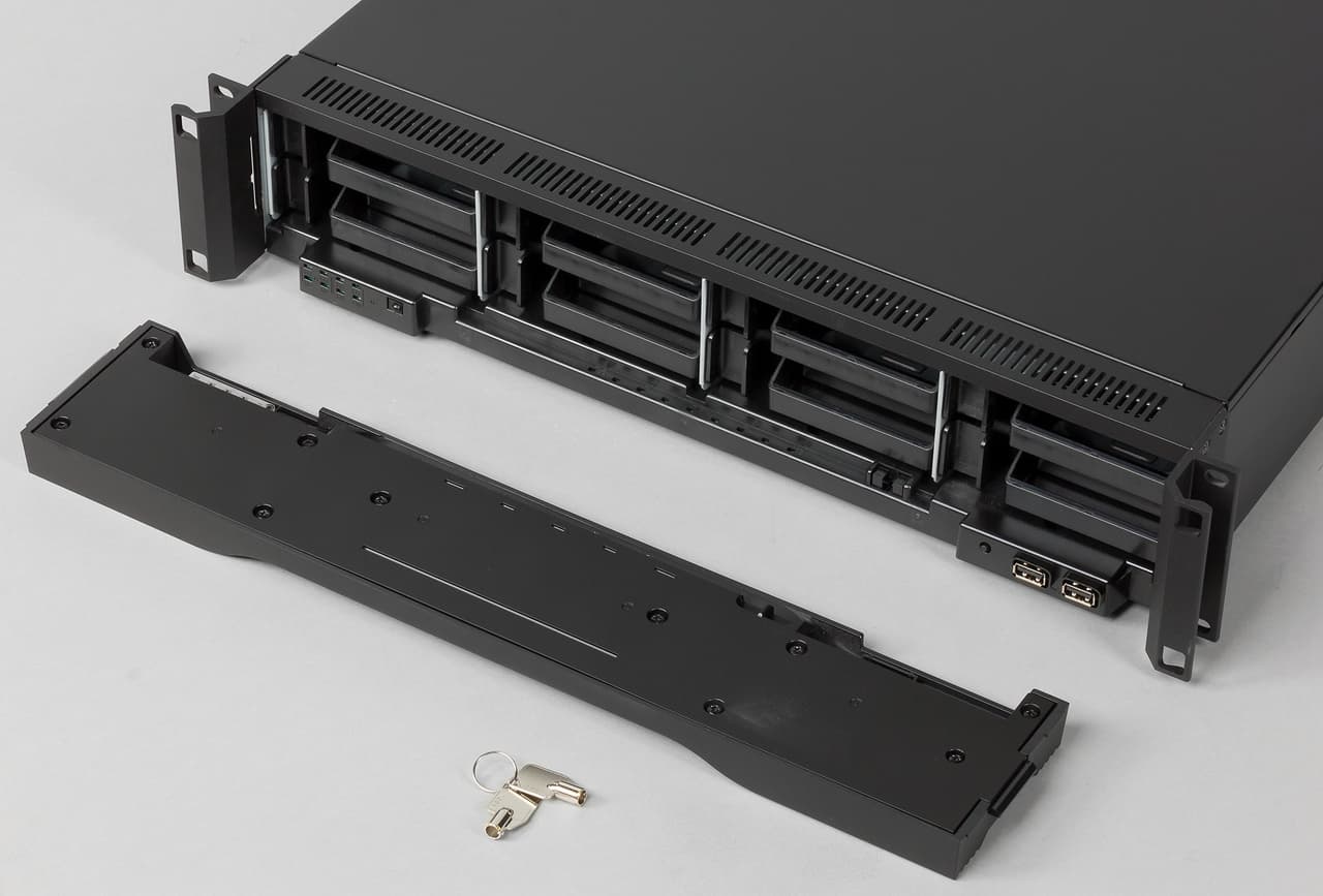 Передняя панель видеорегистратора является пластиковой крышкой, за которой расположены отсеки для установки восьми жестких дисков формата 3,5″. Отметим, что она дополнительно к защелке закрывается и на ключ. На панели присутствует вставка из металла «под грубую шлифовку», на которой присутствует логотип компании и название модели.