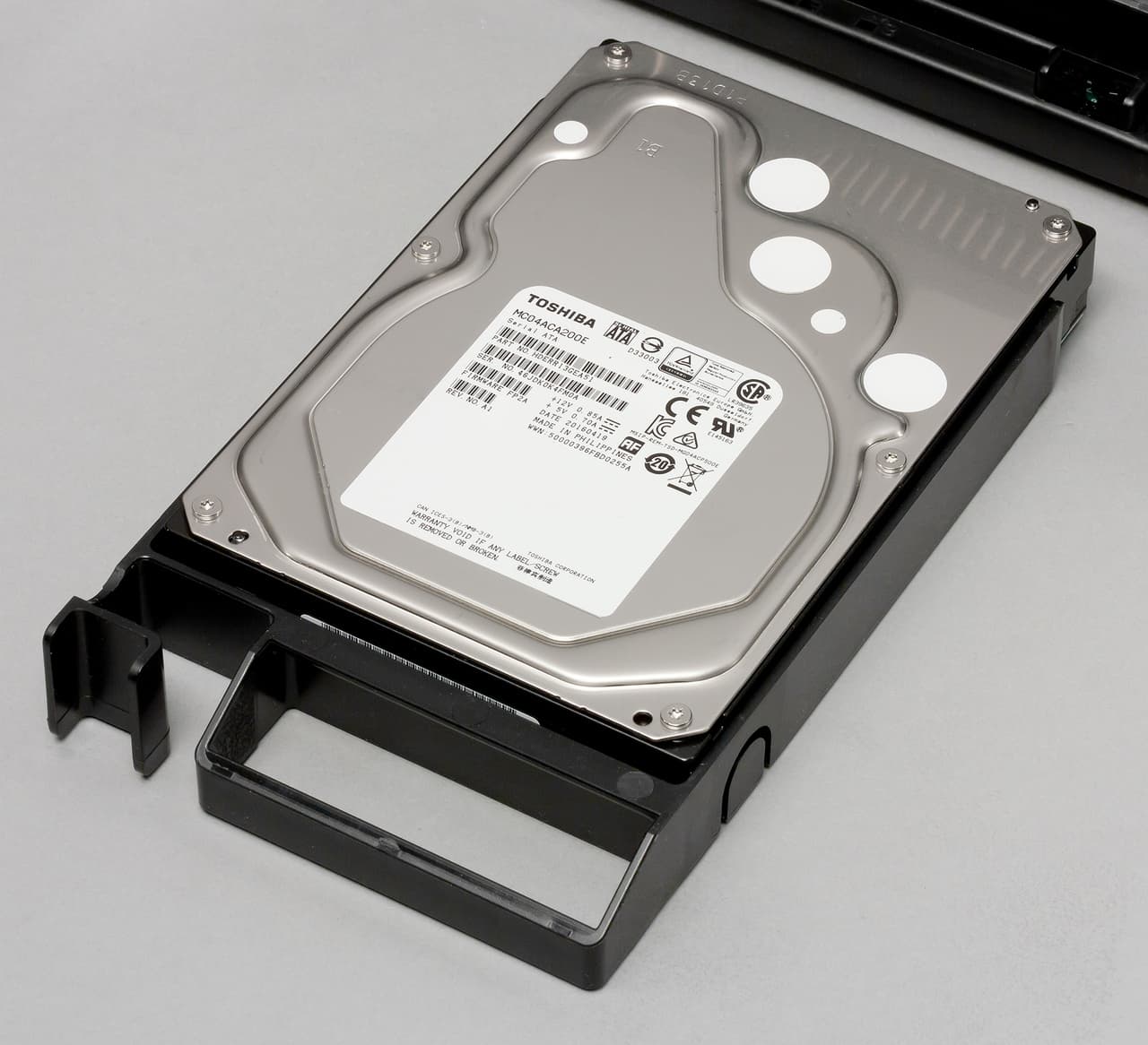 Внутри корпуса регистратора предусмотрено место для установки восьми жестких дисков SATA формата 3,5″ объемом до 8 ТБ каждый. Горячая замена для них не поддерживается. Дополнительно можно добавить на каждый из четырех портов eSATA фирменные модули, вмещающие до четырех накопителей по 8 ТБ. Таким образом, максимальный объем хранилища может достигать 192 ТБ. В случае использования отказоустойчивых конфигураций RAID 1/5/10, полезный объем будет меньше. В текущем списке совместимость представлено несколько моделей винчестеров от компании Toshiba.