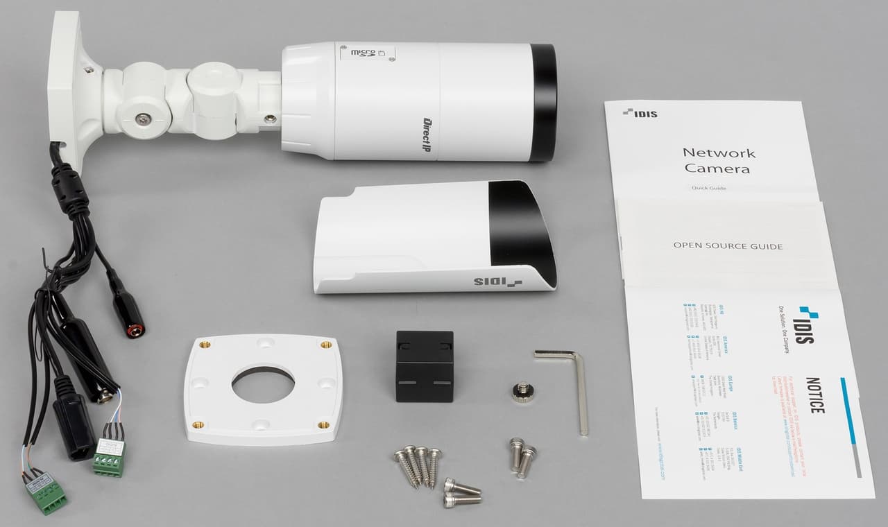 В комплект поставки камеры входит диэлектрическая площадка для крепления, защитный козырек, набор необходимых крепежных элементов, шестигранный ключ для регулировки положения шарниров и краткая инструкция по началу работы. На сайте производителя можно загрузить документацию и обновления прошивки.