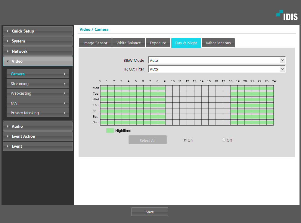 В частности в нем предусмотрено настройка расписания записи, управление пользователями, группами и их правами, недельное расписание для режима день/ночь, определение различных типов событий (включая цифровой вход, анализ движения, звук, блокировка/взлом камеры), уведомления (на цифровой выход, электронную почту, аудиовыход, удаленные системы по сети и запись на FTP), трансляция видео по протоколам RTSP и HTTP, вставка видео на страницу веб-сайта, собственный веб-интерфейс с живой картинкой и доступом к записям на карте памяти (только в Internet Explorer).