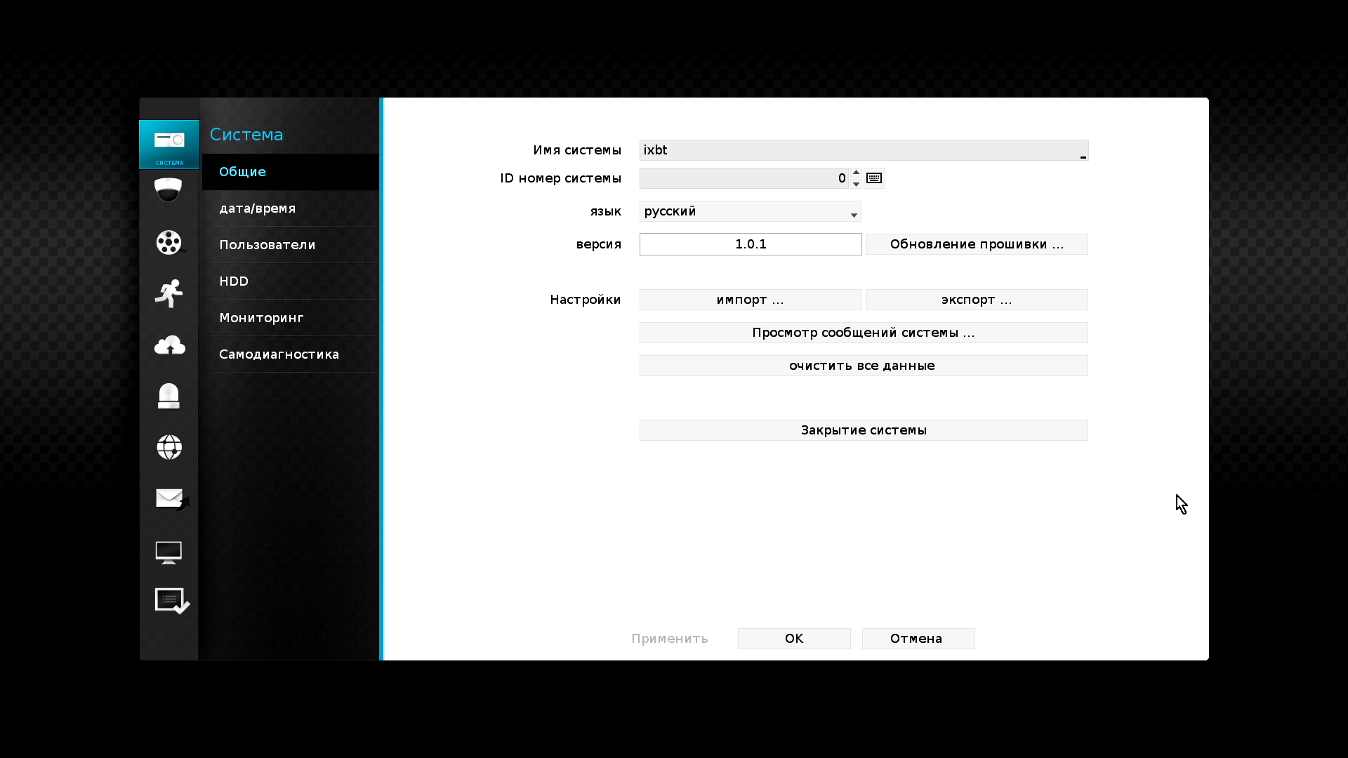 Для вызова основного меню настроек видеорегистратора нужно подвести мышку к верхнему краю экрана и выбрать иконку с шестеренкой. Для доступа потребуется указать пароль администратора. Всего в меню представлено десять групп настроек. Первая группа отвечает за системные параметры. В ней собраны настройки даты и времени, выбор имени устройства, управление пользователями, управление подсистемой хранения (дисками и томами), настройка уведомлений для событий и самодиагностика.