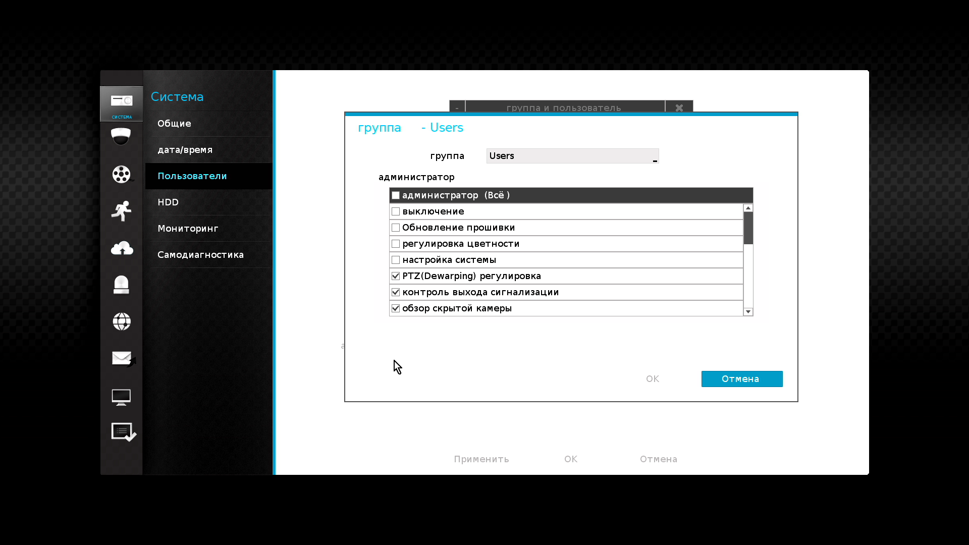 Для удобства работы в крупных системах, а решение с поддержкой 64 камер явно относится к таким, предусмотрено создание пользователей и групп. Причем права выдаются именно на группы.