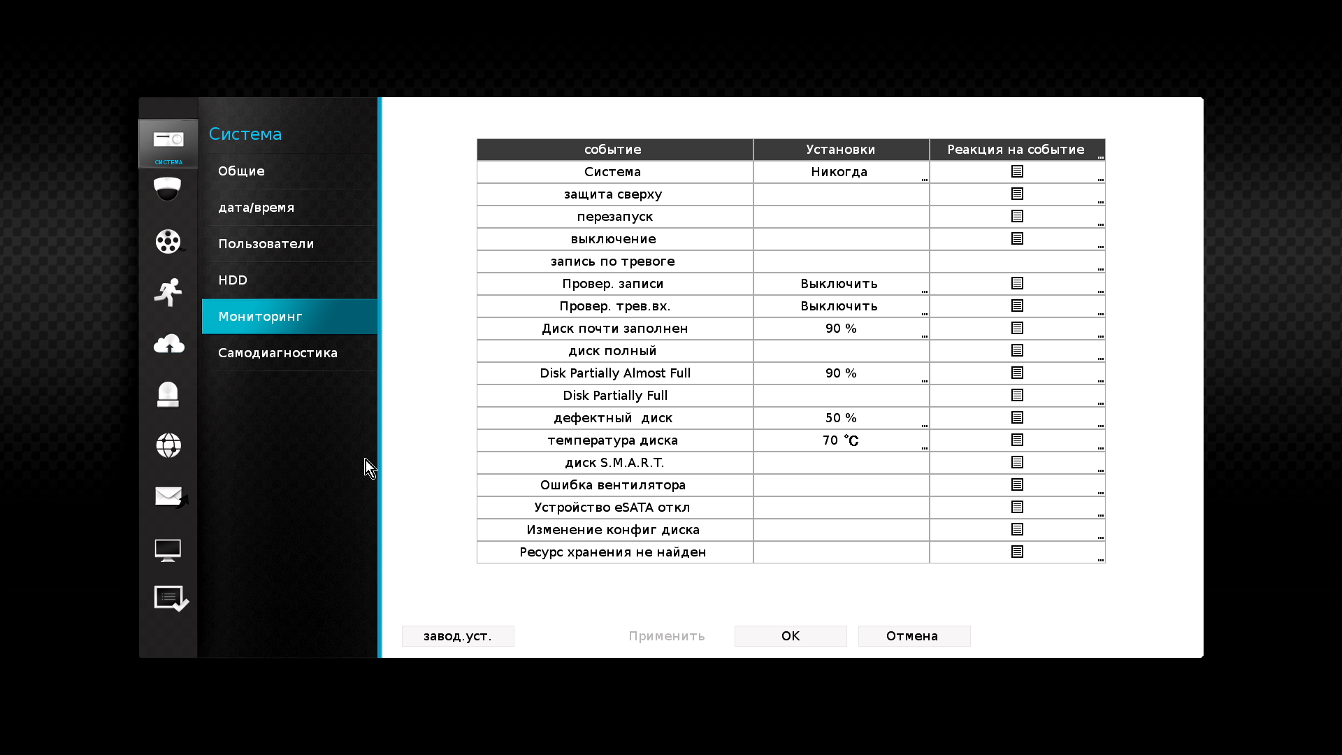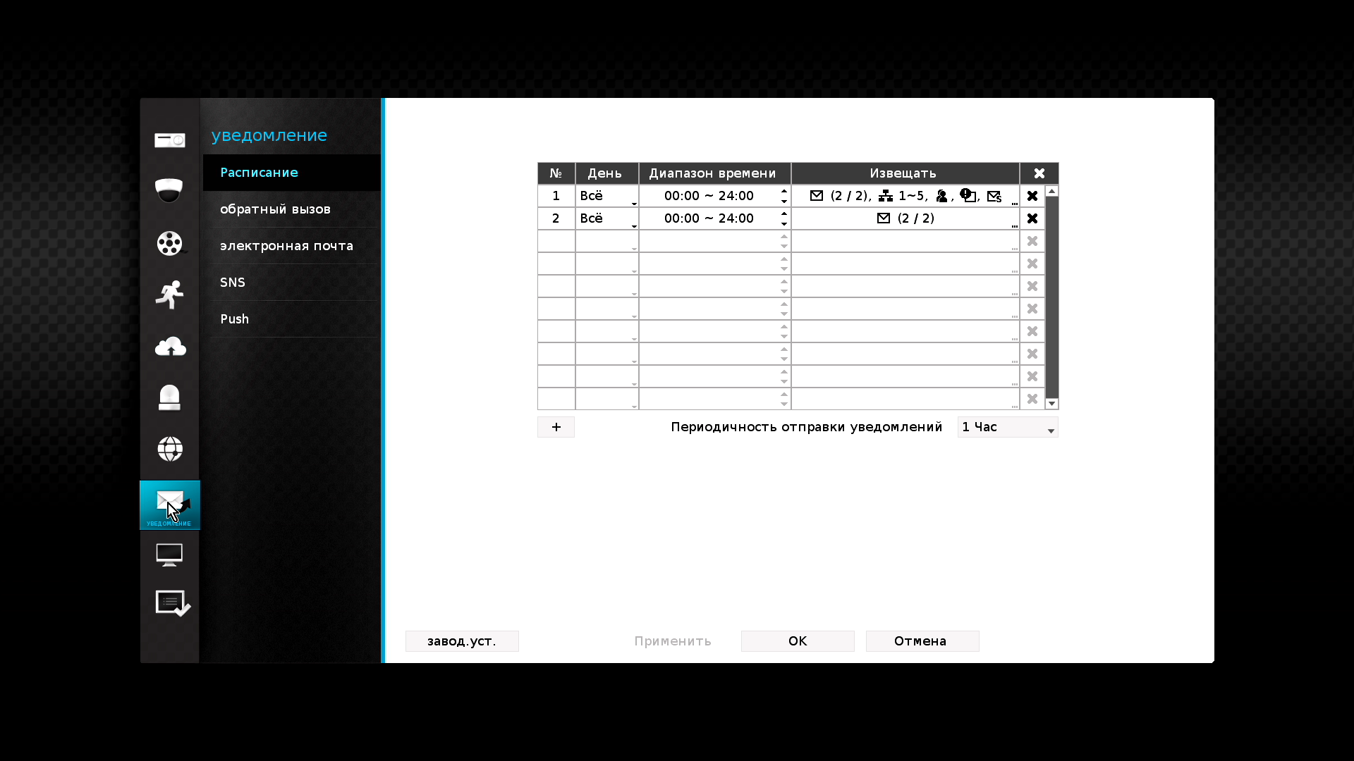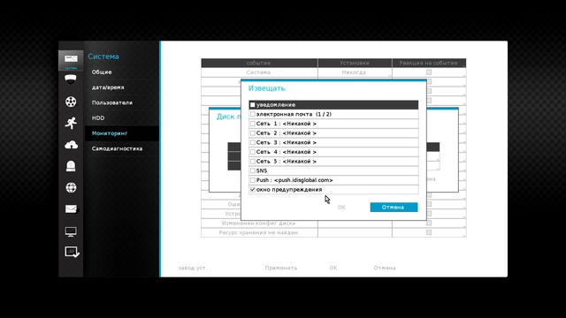 Система уведомлений позволяет выбрать для каждого события, которых в текущей версии прошивки есть восемнадцать, необходимые типы уведомлений пользователя, включая отправку сигнала на встроенную пищалку, цифровые выходы, электронную почту, push-сервис, всплывающие окна.
