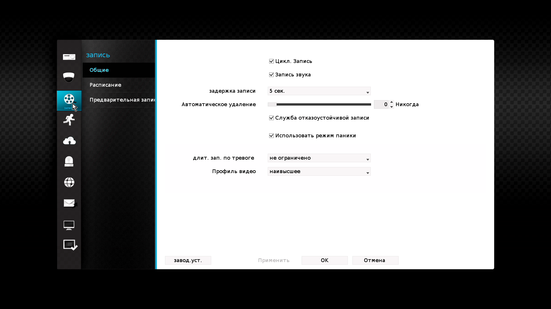Для каждой подключенной камеры доступно больше количество настроек и функций. Заметим, что это относится именно к камере этого же производителя, подключенной в режиме Direct IP. В частности, в этом случае вам будут доступны настройки изображения, настройки профилей для живой трансляции и для записи на жесткий диск, сброс настроек и даже обновление прошивки.