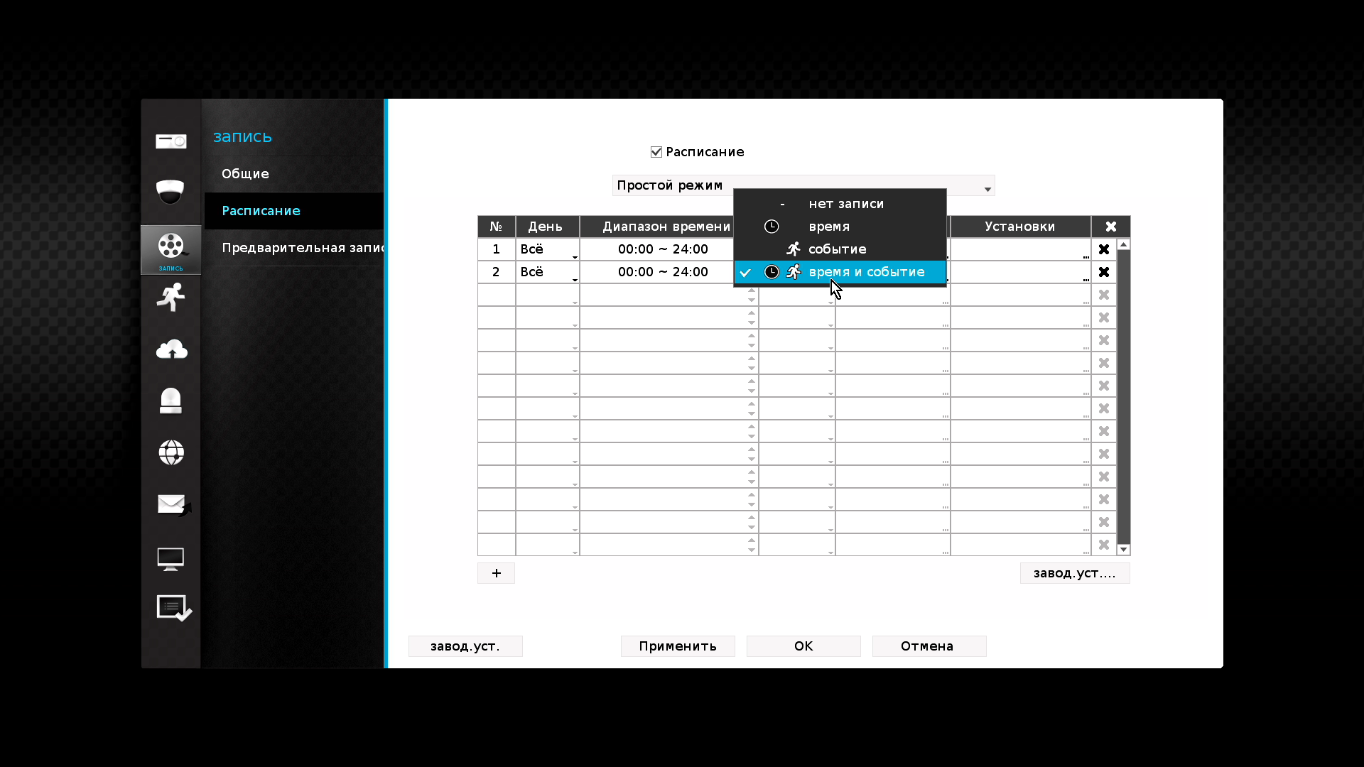 Следующей важной группой параметров является настройка режимов записи, в частности расписаний. Помощник настройки устанавливает одинаковый постоянный режим для всех камер. Но при желании вы можете реализовать более гибкие варианты, включая распределение по камерам, типам (постоянная запись или запись при срабатывании детекторов), качеству, дням недели и времени (с точностью до 15 минут).