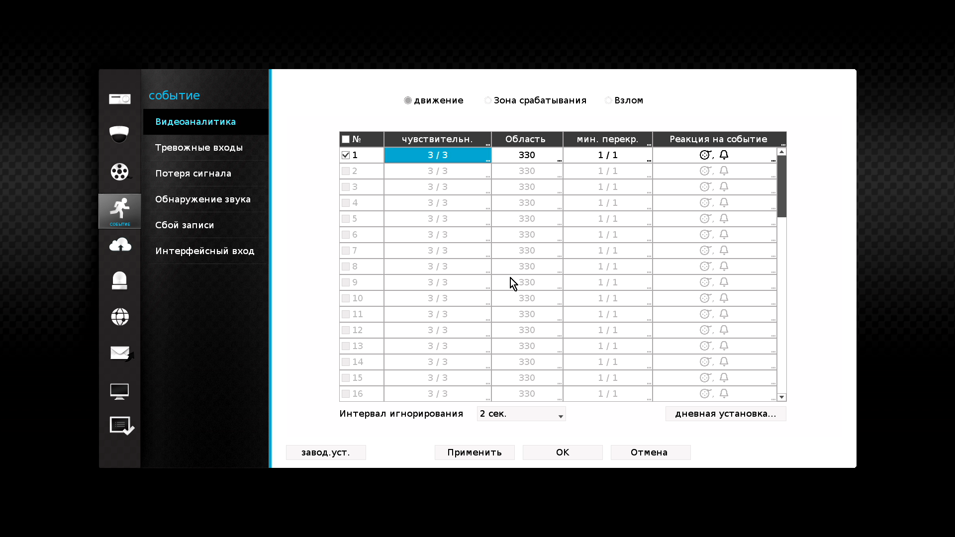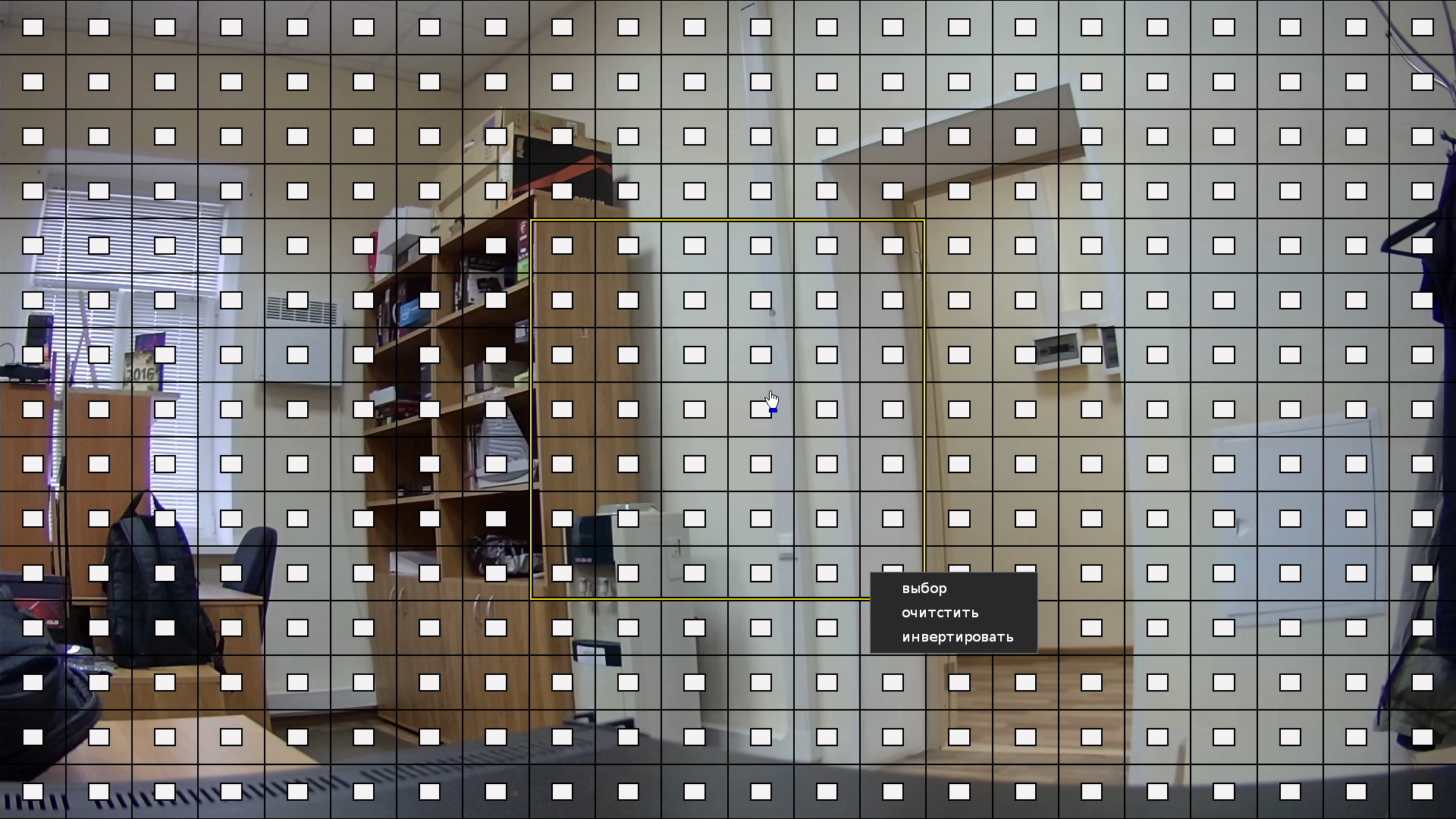 Для данной функции у каждой камеры предусмотрены выбор части кадра из сетки 22×15 элементов и установка чувствительности. Аналогичным образом реализована обработка событий «Зона срабатывания» (движение объекта в/из указанной зоны) и «Взлом». В дополнительных опциях можно настроить разные режимы день/ночь для использования данных детекторов.