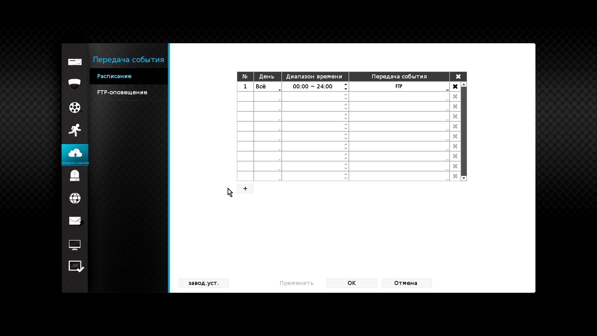 Настройки сервиса отправки видеофайлов на серверы FTP при возникновении тревожных событий выделены в отдельную группу «Передача события». Здесь вы можете указать расписание работы этой функции и формат загружаемых файлов. Предварительно нужно будет настроить аккаунты для удаленных серверов на странице NetFS группы сетевых настроек.