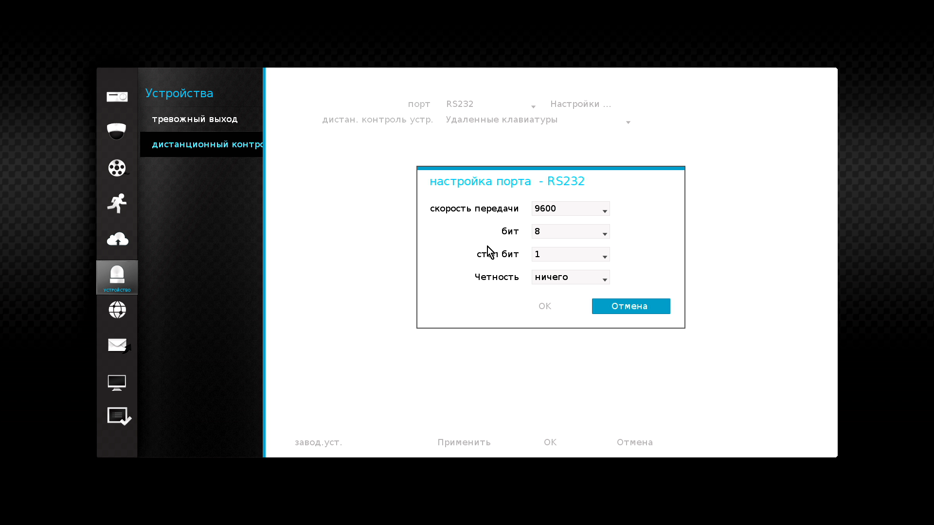 Страница «Устройства» позволяет настроить режимы работы тревожных выходов и порты RS-232 и RS-485 для удаленного управления. Вторая возможность пригодится для интеграции в крупные ИТ-системы.