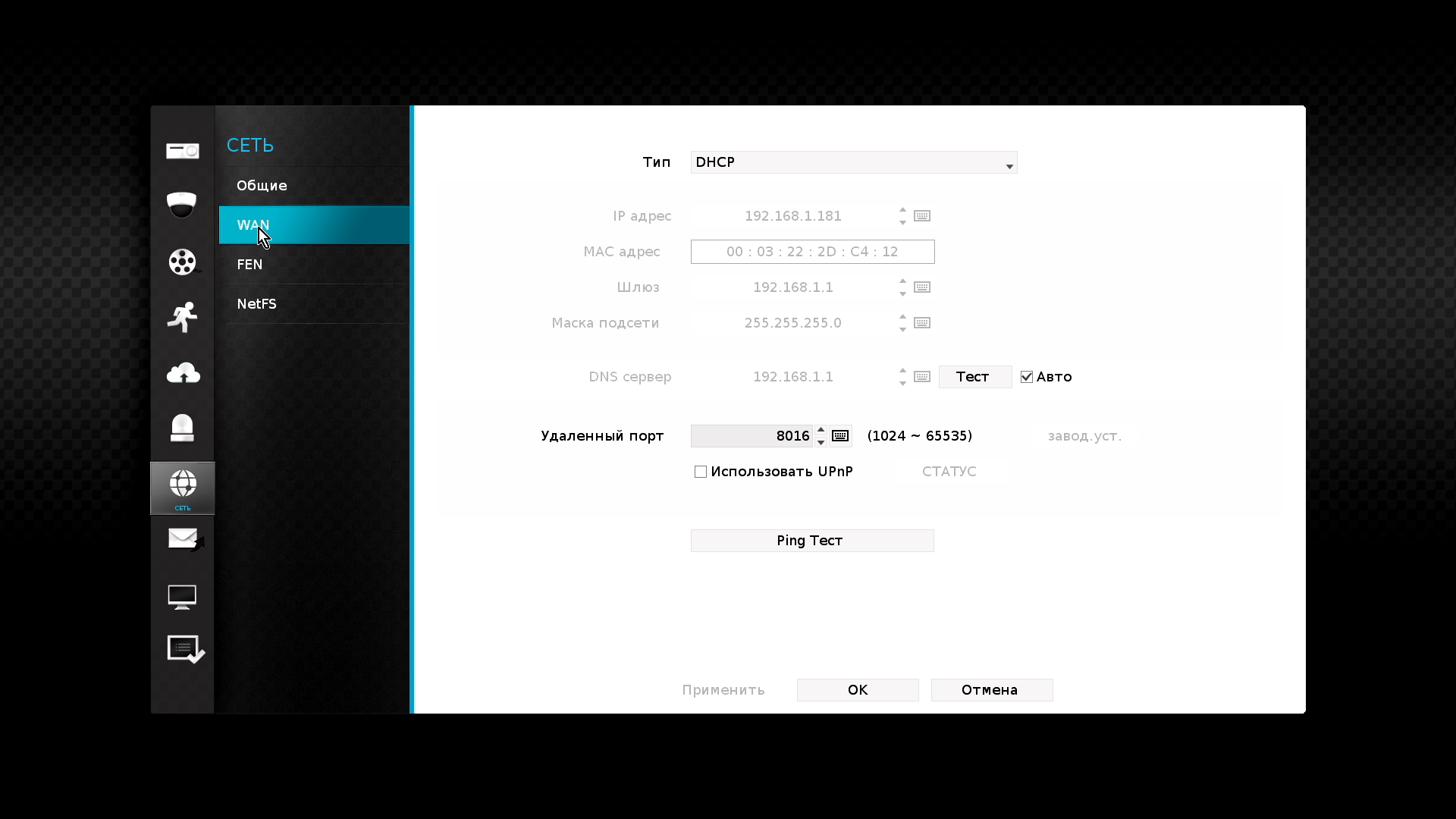 Сетевые настройки включают в себя установку IP-адреса, включение удаленного доступа, включение сервиса FEN, активацию сервиса NetFS. FEN позволяет вам использовать для получение доступа к регистратору с компьютеров или мобильных устройств с указанием простого для запоминания короткого имени. Предусмотрена автоматическая настройка правил трансляции маршрутизатора по технологии UPnP.