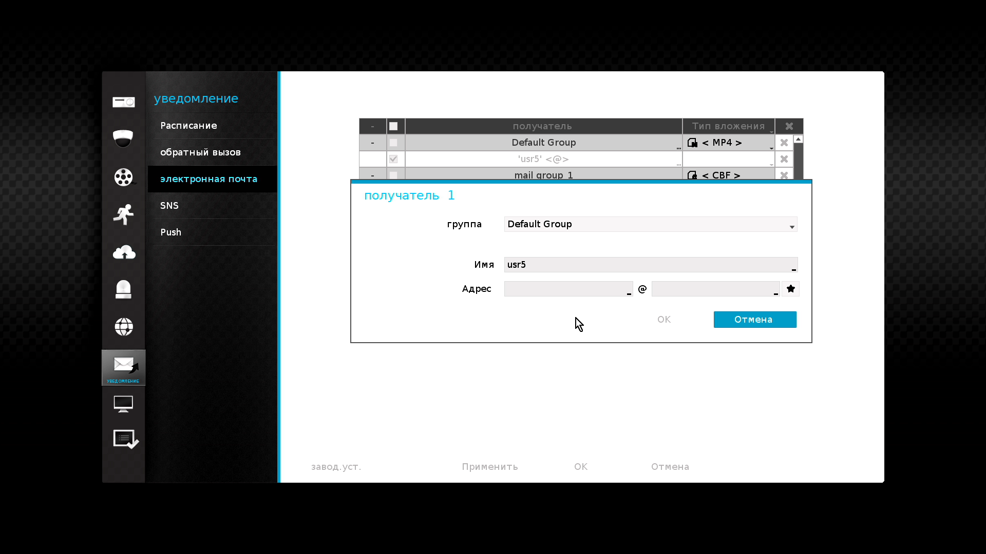Система уведомлений регистратора способна одновременно использовать несколько каналов для отправки уведомлений. В частности, здесь есть электронная почта, твиттер и push-уведомления. Для удобства, адреса получателей для первого варианта можно организовать в группы.