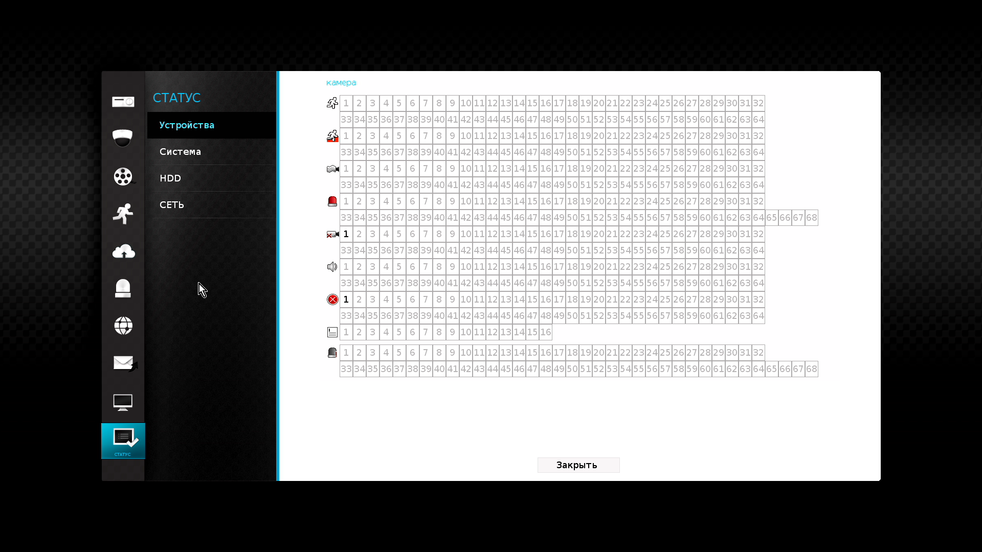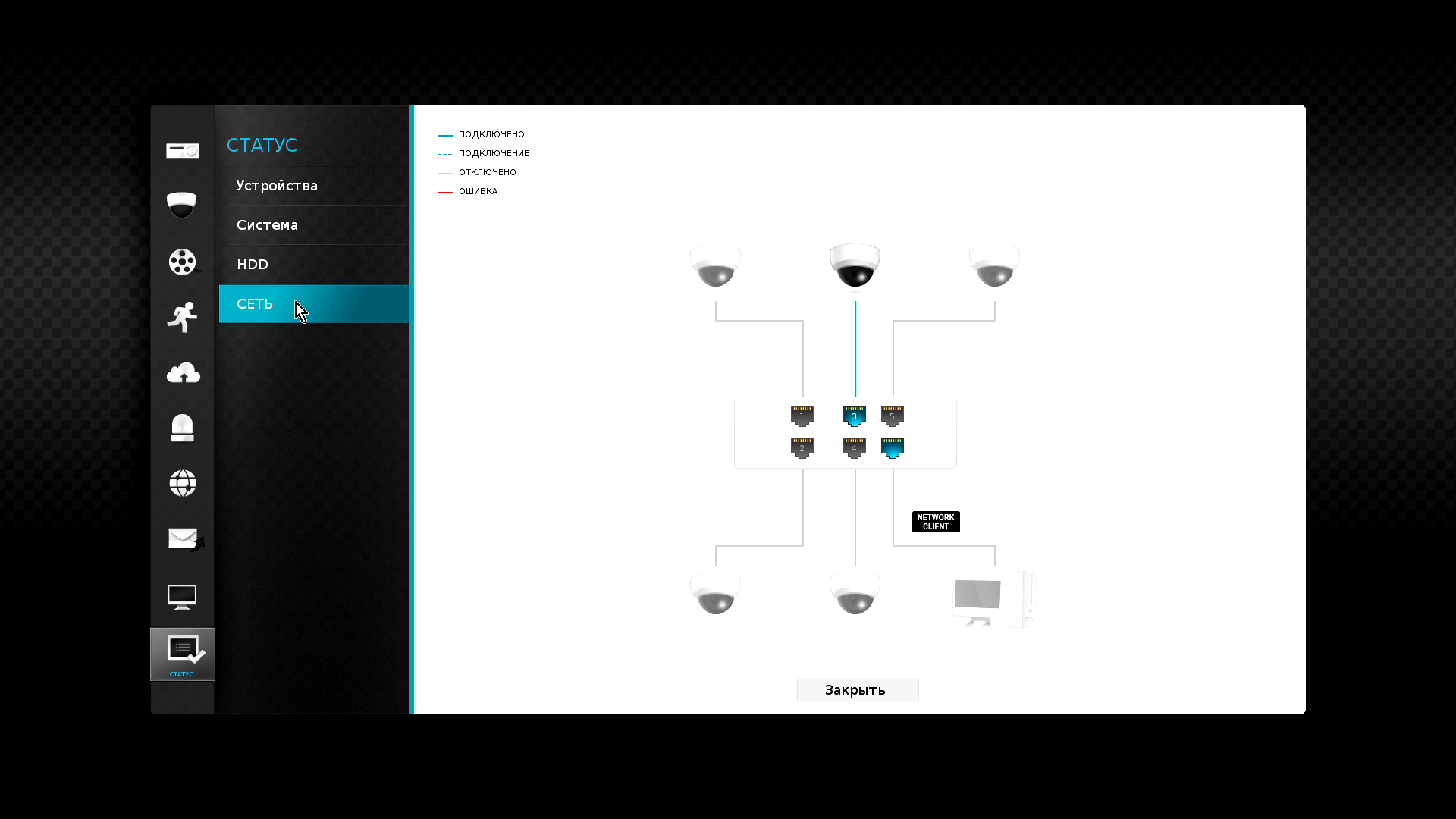 Последняя группа — «Статус» — может быть интересна для контроля состояния элементов системы видеонаблюдения. В частности здесь есть данные о статусе всех камер, датчиков и жестких дисков (включая общую оценку SMART), а также графическое представление сетевых соединений видеорегистратора.