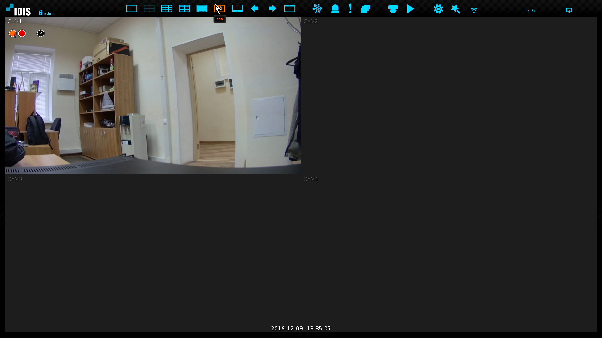 Базовый вариант использования устройства — отображение поступающей информации с камер в реальном времени. Каких-то существенных от других подобных решений здесь нет. Можно настроить вариант расположения камер на экране (в том числе и сразу 64 на сетке 8×8), использовать режим перебора, включить или выключить отображение дополнительной наэкранной информации (OSD), «заморозить» изображение, быстро перейти к конкретной камере, сбросить текущий сигнал тревоги, включить «Паническую запись». Меню с этими дополнительными опциями появляется в верхней части окна. Также в нем есть несколько статусных значков и кнопки для перехода в режимы просмотра и настройки.