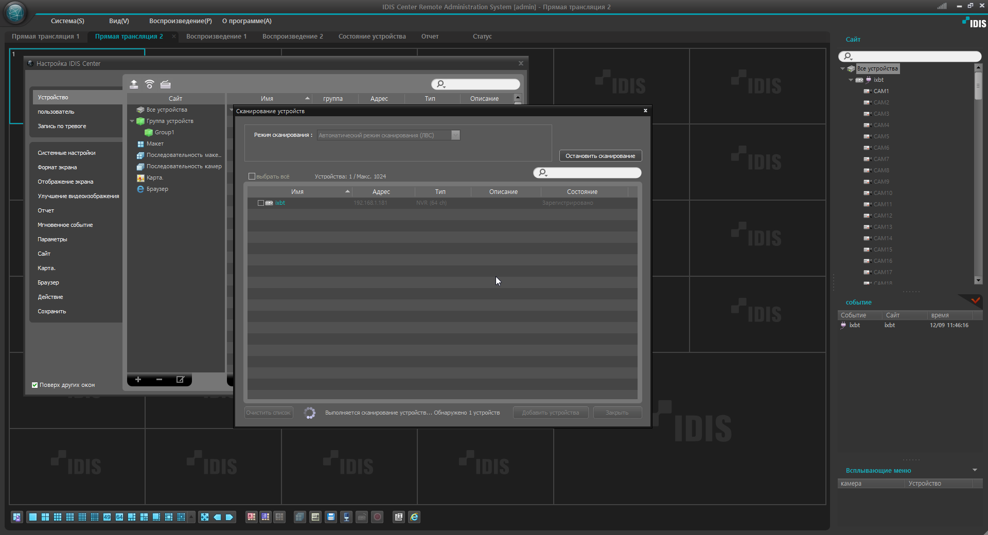 Для настройки камер нужно щелкнуть на основном поле экрана правой кнопкой мышки, что несколько необычно. Камеры с поддержкой Direct IP будут найдены автоматически, если они подключены в соответствующие порты видеорегистратора. Для остальных нужно использовать сканирование сети. При этом в списке можно выбрать тип камеры — Idis, ONVIF, AXIS или Panasonic. К сожалению, попытка использовать ONVIF модель от стороннего производителя не увенчалась успехом. Камера не смогла полноценно подключиться к этому видеорегистратору.