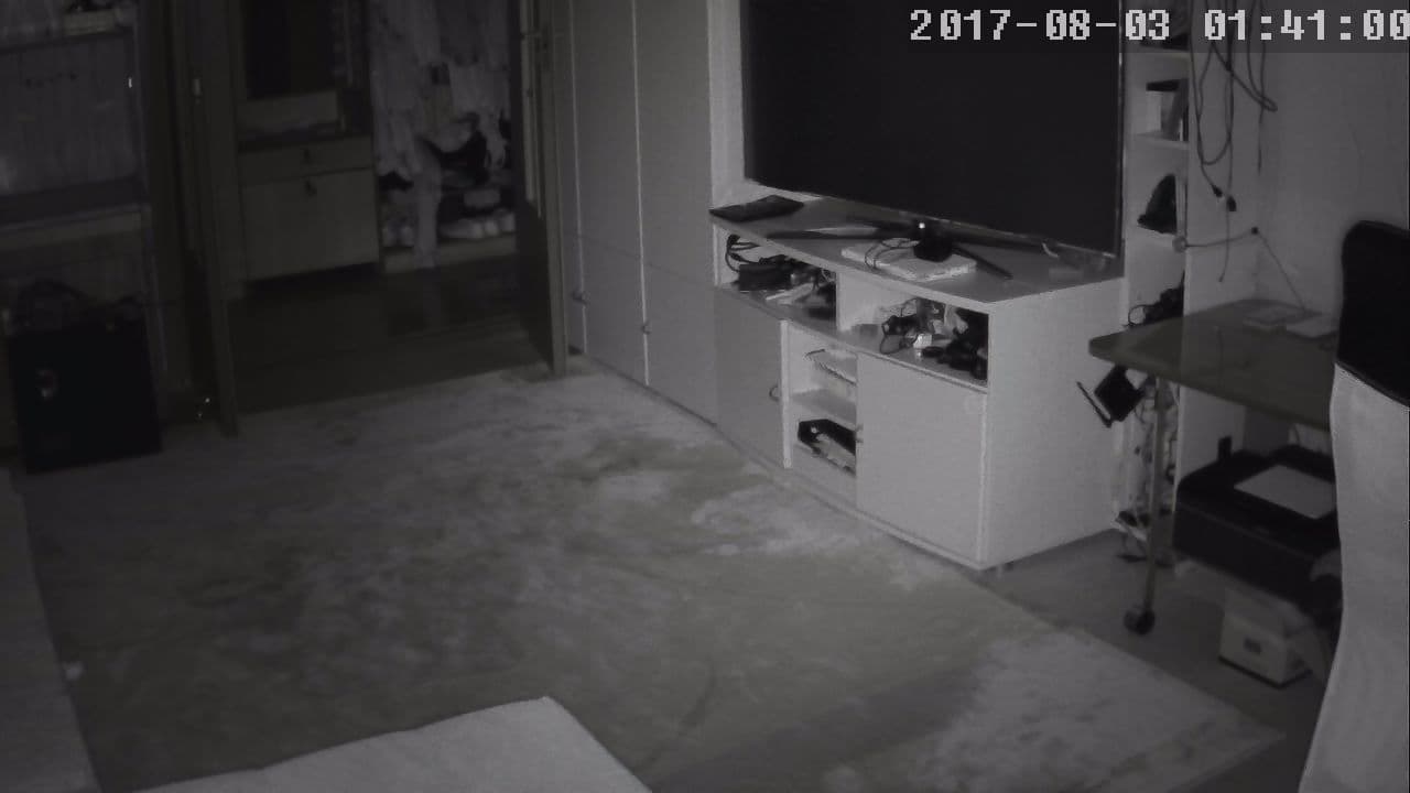 Инфракрасная подсветка камеры, как уже говорилось, распределяется относительно ровно по всей площади обзора объектива. Часто встречаются камеры, ночная подсветка которых сконструирована неправильно, давая слишком узкий пучок либо слишком большое рассеяние. Здесь же, как видим, все объекты в кадре становятся неплохо видны даже в полнейшей темноте (стоп-кадр из ночной съемки в комнате).