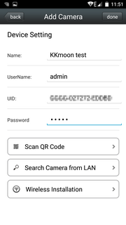 Итак, в нашем случае первичную установку камеры можно осуществить несколькими способами. Основным способом считается регистрация в фирменном облачном сервисе с помощью смартфона или планшета. Управление всем процессом осуществляется в фирменном приложении KKmoon. Регистрация производится, в свою очередь, также несколькими способами: путем ручного ввода идентификатора камеры, путем сканирования QR-кода, который наклеен на дно корпуса, автоматическим поиском камеры в локальной сети, и, наконец, с помощью аудио-общения смартфона с камерой. Первые три способа не вызывают никаких эмоций, но в последнем случае довольно увлекательно слышать электронное пересвистывание, когда смартфон шифрованным переливом сообщает камере имя Wi-Fi-сети и пароль к ней.