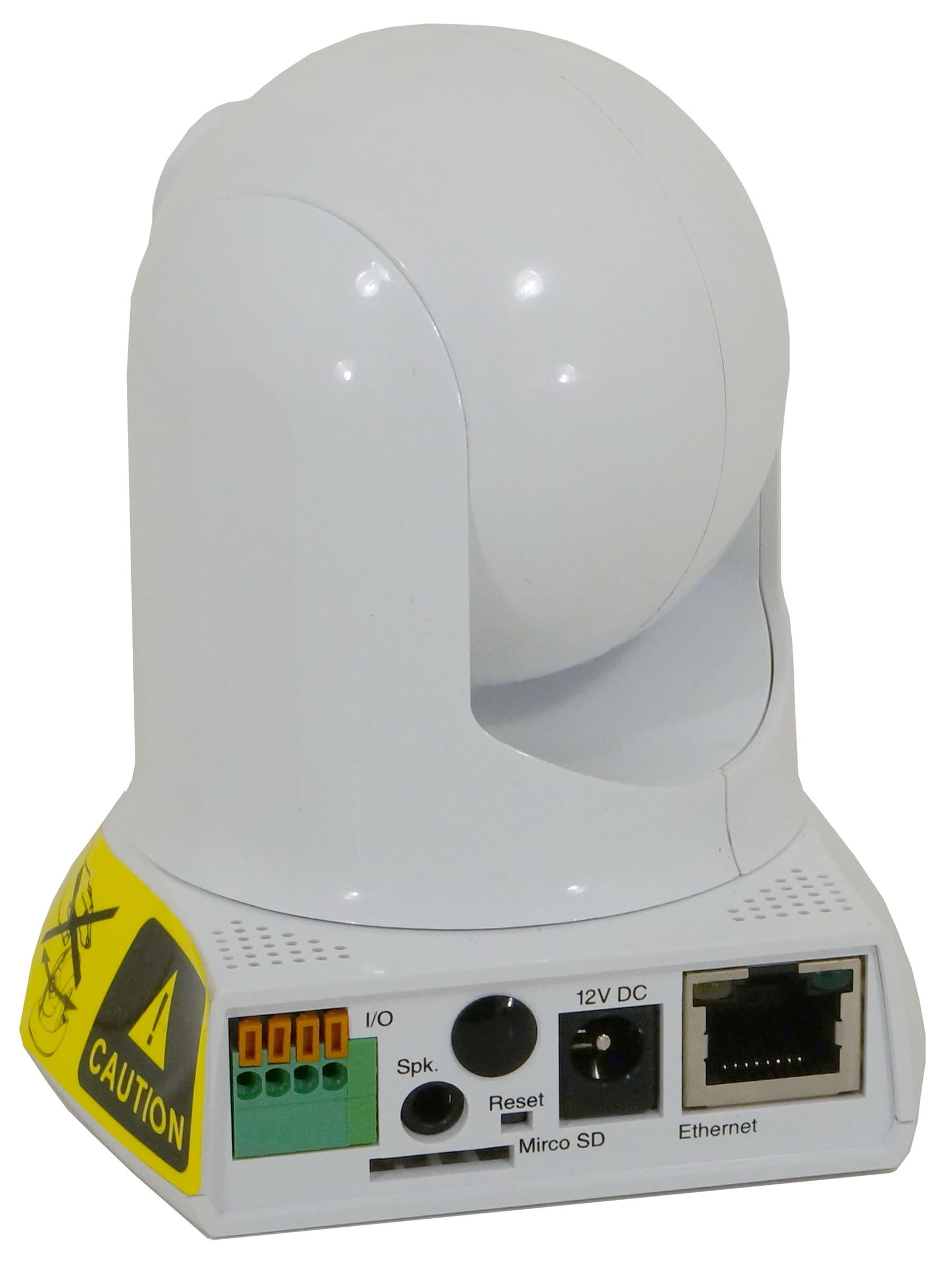 Вторая камера, которую мы изучим, предназначена уже для комнатного использования, что внешне сразу же видно. Пластиковый корпус состоит из трех частей — неподвижного основания, поворотной платформы и подвижного шара с камерой внутри. Похоже, что вся управляющая электроника прячется в основании-подставке, в то время как внутри наклоняющегося шарика, зажатого в рогатке поворотной платформы, находится лишь оптика и датчик изображения. Данная камера имеет инфракрасную подсветку, ее обеспечивают светодиоды по периметру объектива.