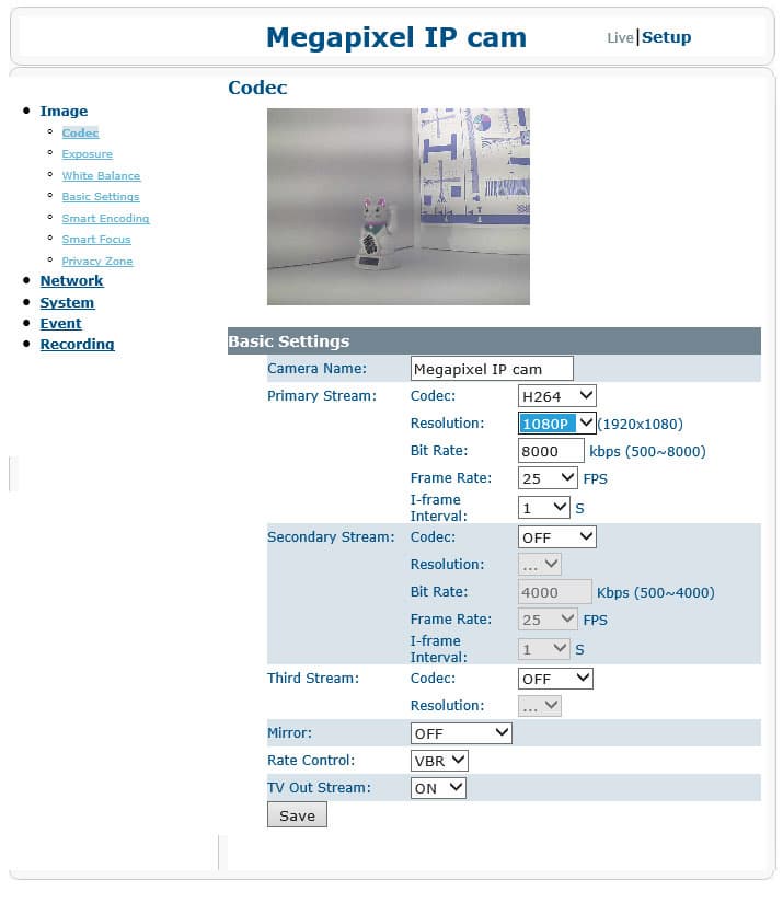 | Настройки рассматриваемой камеры имеют широкий выбор параметров, отвечающих за картинку: доступно детальное управление параметрами экспозиции, выбор способа переключения в ночной ИК-режим, агрессивность усиления. Разрешение (точнее, размер кадра) варьируется от 1280×800 до 320×180, кодирование потока возможно как с постоянным, так и переменным битрейтом. При трансляции камера способна добавить поверх видео информацию, содержащую имя камеры, текущие дату и время. | |