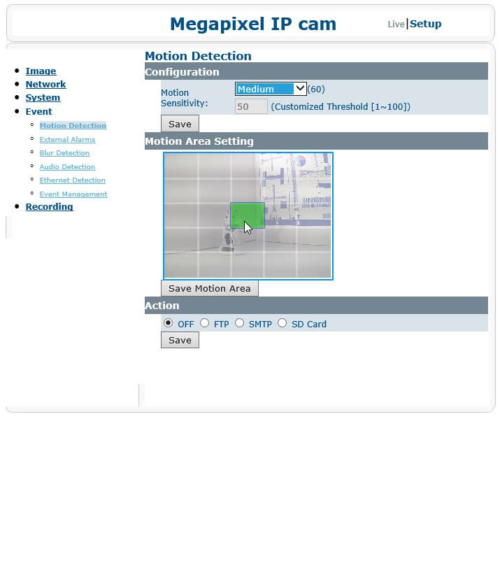 | Для настройки детектора движения могут использоваться зоны активности, которые выбираются мышкой из представленной на миниатюре сетки ячеек. Камера определяет не только движение в кадре — здесь имеются настройки обнаружения звука и даже потеря четкости (например, запотевания объектива камеры). Также камера реагирует на сигналы с внешних охранных датчиков. Способами оповещения о произошедших событиях являются традиционные E-Mail, FTP и SMTP, а также запись видеоролика с событием на карту памяти, установленную локально. | |