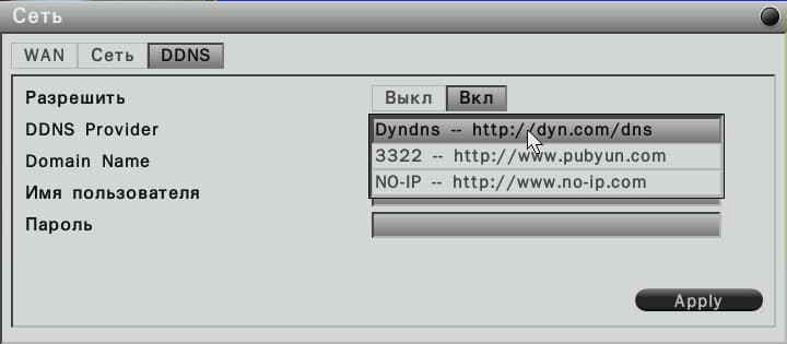 Вместо этого бесполезного занятия имеет смысл обратить внимание на важнейшие параметры самого регистратора. Например, такой параметр, который позволит управлять регистратором удаленно, через Интернет, в случаях, когда IP-адрес пользователя регулярно меняется. Для таких случаев в аппарате имеется поддержка трех ресурсов, предоставляющих динамические DNS: Dyndns, 3322, и NO-IP. Разумеется, для того, чтобы воспользоваться услугами этих сервисов, требуется наличие учетной записи в них. А это, увы, не всегда бесплатная услуга. Но безопасность всё равно дороже.