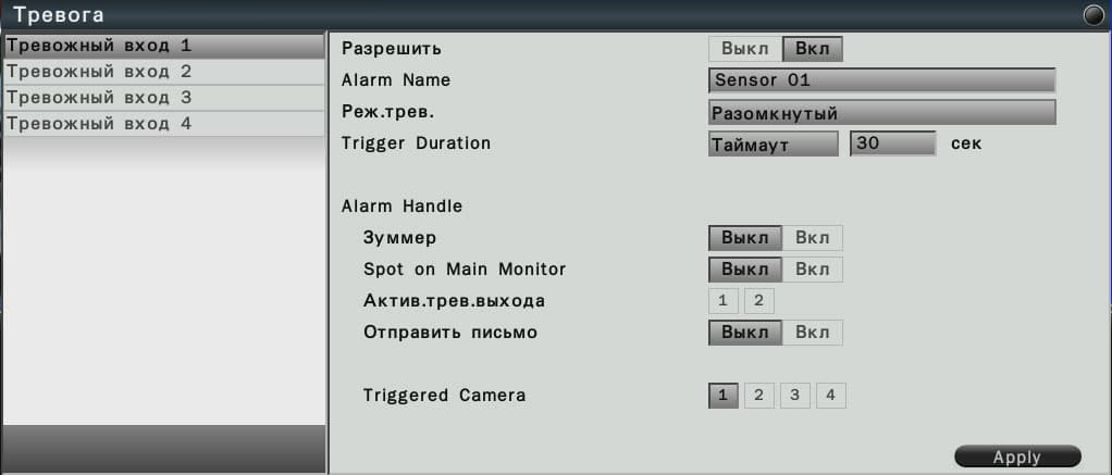 Но есть в регистраторе и еще один орган для реагирования на окружающую действительность. Точнее, даже четыре. Речь о тревожных входах, к которым могут подключаться датчики. Для настройки этих входов, вариантов их реагирования на сработку, в регистраторе имеется отдельное окно параметров.