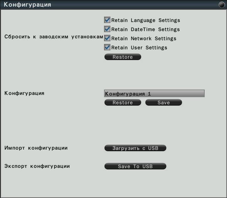В заключение еще об одной полезной функции. Данный регистратор может иметь несколько вариантов настроек, каждый из сохраняется в разных конфигурациях. Файлы конфигураций могут быть сохранены на USB носитель, и быстро восстановлены.