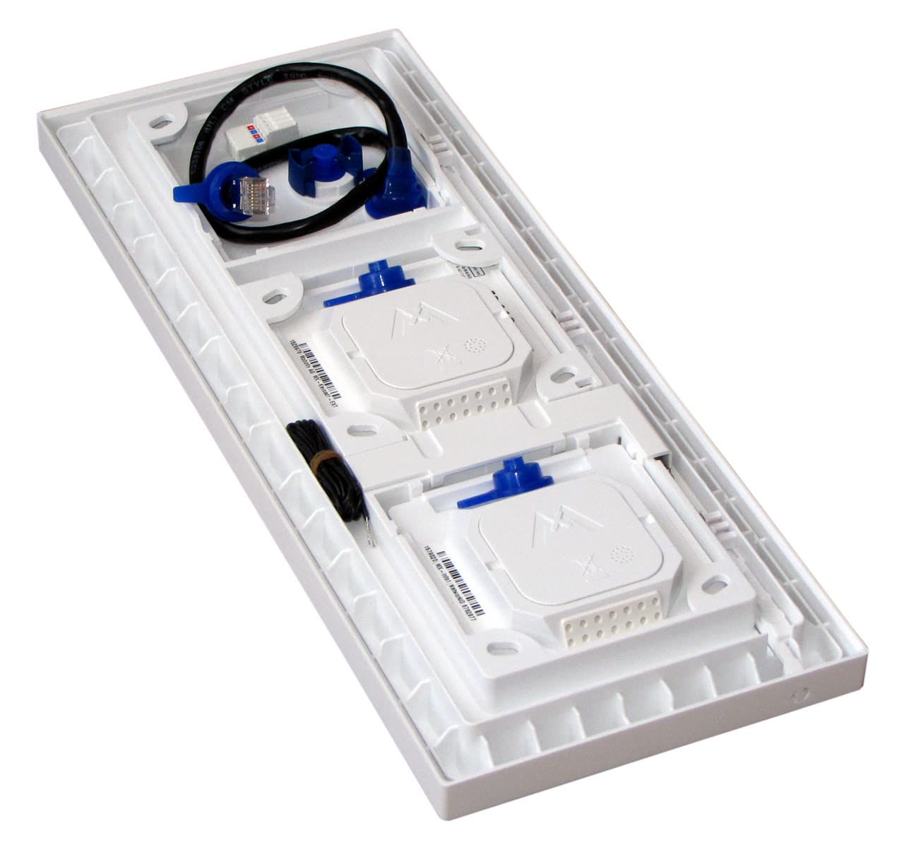 Основное назначение этого модуля — информационное оповещение. На экран с LED-подсветкой вы можете поместить информацию с номером дома, фамилией абонента или любую другую информацию на ваш выбор. Также существует и модификация этого модуля под названием «MX2Wire», которая позволяет организовать передачу аудио- и видеопотока по Ethernet, а также питания на домофон с помощью двухпроводной линии. Внешне он выглядит точно так же, но в этом случае в базовый комплект Mobotix T24 Starter Kit добавляется еще один модуль, назначение которого — «упаковать» в двухпроводную линию и данные, и питание: