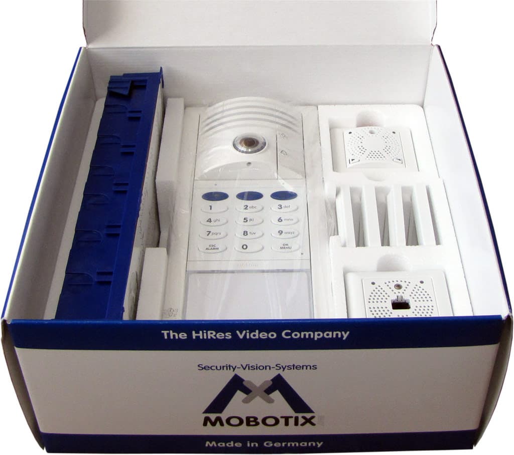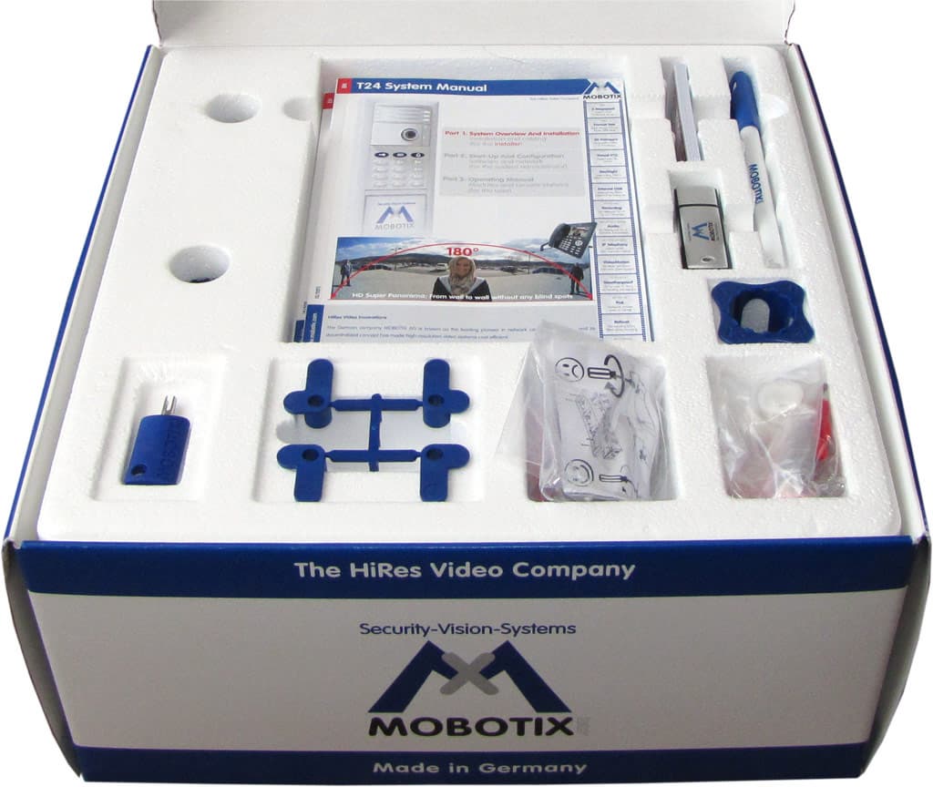Mobotix T24 Starter Kit поступил к нам на изучение в составе двух коробок — собственно сам домофон и вышеупомянутый видеофон GXV3140. После того, как коробка с «Mobotix T24 Starter Kit» была открыта, мы увидели следующее: