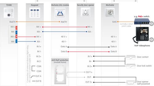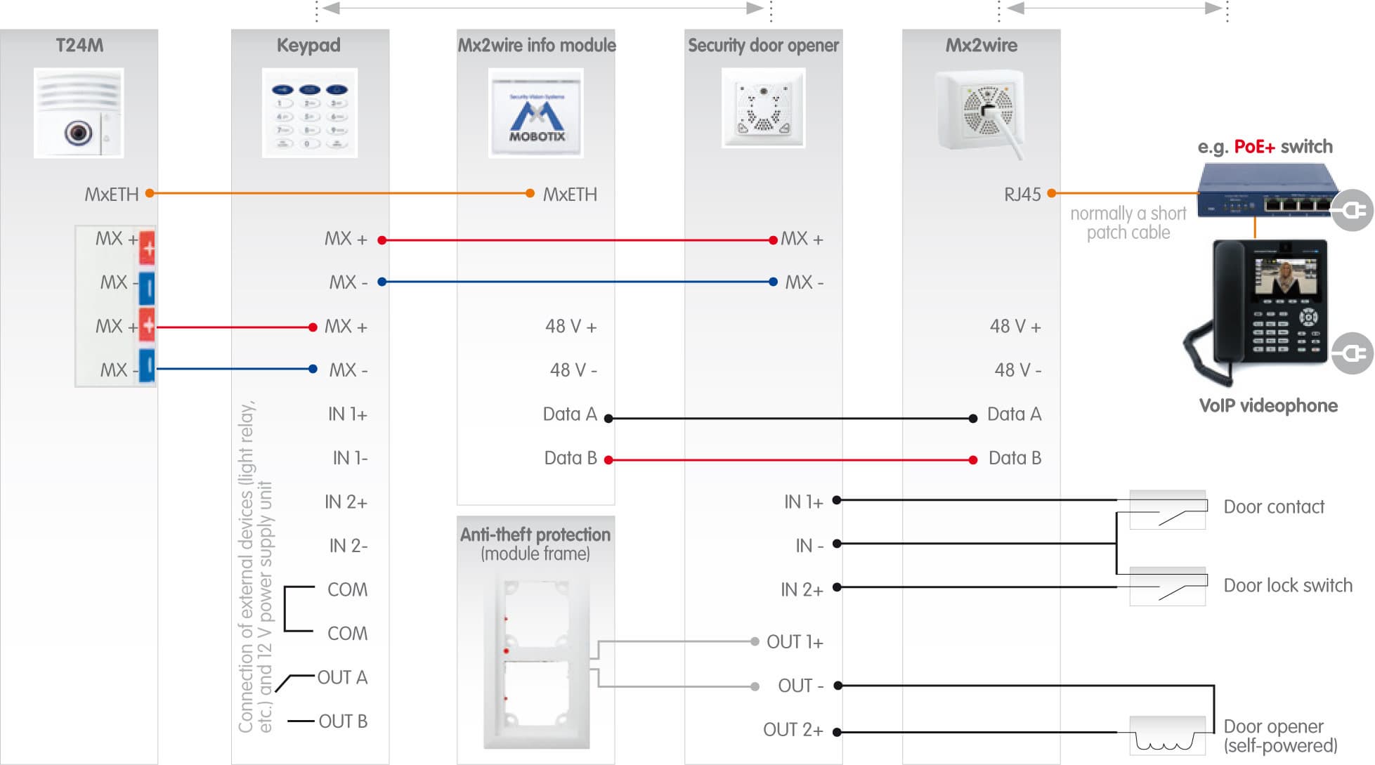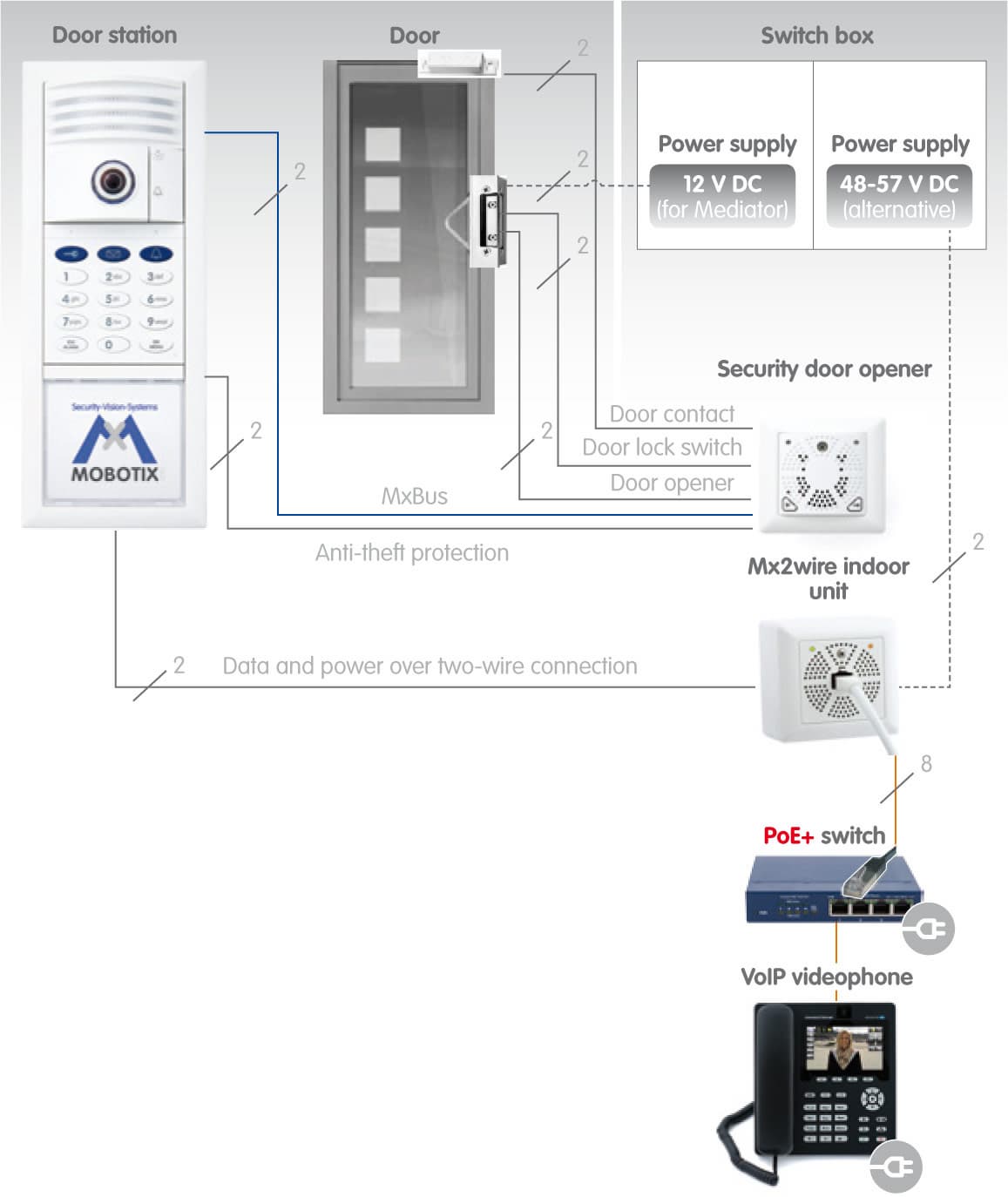 Монтаж Mobotix T24 Starter Kit неожиданно несложен. Если у вас есть навыки по монтажу чего-либо электрического, то трудности в этом процессе маловероятны. Все что вам по-настоящему нужно для успешного завершения процесса монтажа — это две нижеприведенных схемы: