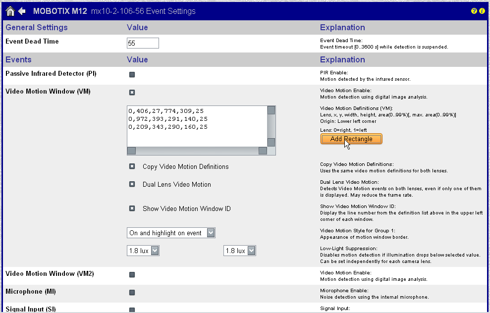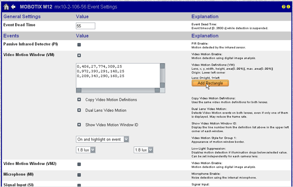 На открывшейся странице настроек детекции движения нажмите кнопку Add Rectangle, и в окне слева появится новая строка с шестью числовыми последовательностями. Эта строка — и есть вновь созданная зона детекции движения, теперь камера будет фиксировать любые изменения картинки в пределах добавленного прямоугольника, а в случае тревоги производить запись кадров. Окон таких может быть сколько угодно в зависимости от нужд пользователя, при этом каждому окну можно задать собственные настройки чувствительности.