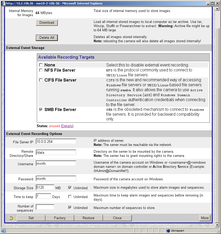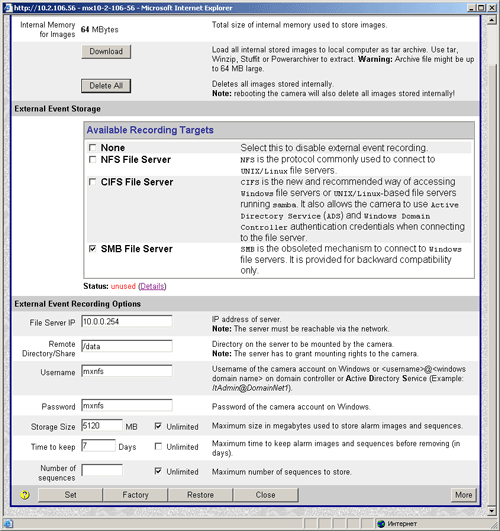 В анонсе данного обзора звучало слово "универсальный". Мы убедились, что устройство и в самом деле — не просто камера. А теперь убедимся в этом вдвойне: герою обзора для работы не нужен компьютер. Что это означает? Всего лишь тот факт, что камера начинает работу (слежение, оповещение) сразу после подачи на нее питания. ПК будет необходим только тогда, когда вы решите вмешаться в деятельность устройства, изменить какие-либо настройки, или просмотреть архив видео и других событий. Внутренняя память камеры невелика — всего 64 мегабайта, однако их вполне достаточно для хранения 4000 кадров размером 320х240 точек (или 600 кадров с разрешением 1280х960). Более того, производитель обещает скорую поддержку карт памяти форм-фактора Secure Digital, слот для которых, как мы помним, уже имеется. Поддержка будет осуществлена с помощью новой, разрабатываемой в настоящее время прошивки аппарата.