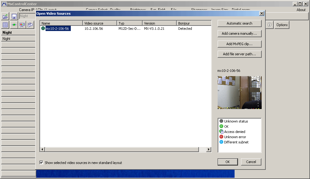 Наконец, просто необходимо упомянуть о бесплатной программе, специально созданной для работы с камерами Mobotix (данный пакет можно скачать с сайта производителя). Программа эта носит название MxControlCenter, и чрезвычайно проста в использовании. Сразу после запуска программы следует выбрать источник видео (или несколько источников, если таковые присутствуют).