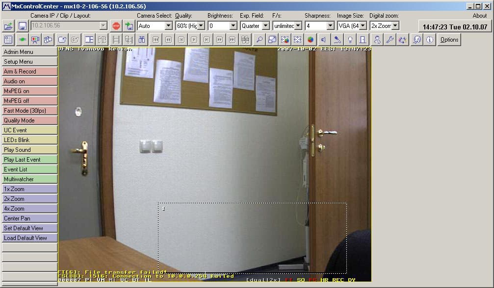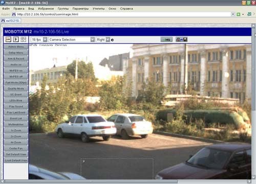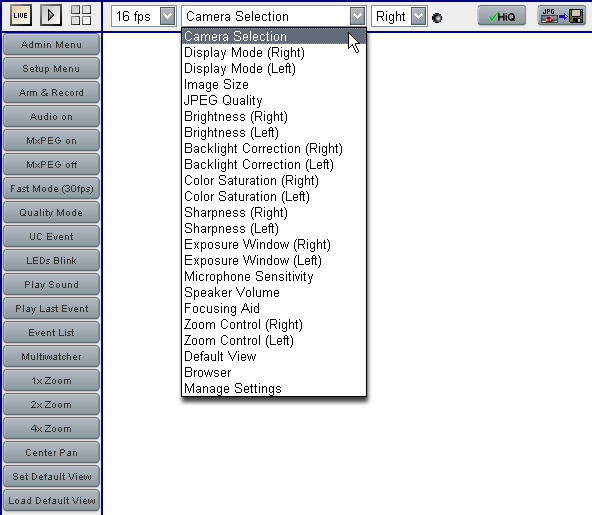 Назначение кнопок и меню здесь понятно с первого взгляда. Первая вверху слева кнопка LIVE включает режим просмотра "живого" видео, следующая за ней кнопка включает режим просмотра архива, а третья — запускает режим отображения видео с нескольких подключенных камер. Расположенное правее выпадающее меню позволяет выбрать скорость видео в кадрах/сек. Наконец, главное выпадающее меню включает в себя список параметров, настраивающихся в дополнительном меню, расположенном правее. Кнопка HiQ возвращает параметры изображения и записи в рекомендованные (оптимальные) значения, ну а назначение последней кнопки с изображением дискеты понятно любому: конечно же, сохранение текущего кадра в графический файл формата JPG.