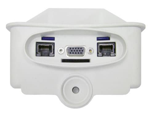 Вид на камеру снизу может о многом сказать специалисту. Здесь присутствуют разъемы LAN, ISDN и универсальный многофункциональный 15-контактный коннектор D-Sub, осуществляющий прием/передачу аудиосигнала, вход/выход сигналов внешних датчиков, в том числе силовых. Некоторая часть информации, передаваемая камерой через Ethernet, дублируется этим же коннектором. Вдобавок здесь же присутствует и USB-порт, позволяющий подключить внешний накопитель данных. Координирует же работу всего этого количества разномастных сигналов приобретаемая отдельно плата MOBOTIX MODUL CAM I/O, которая подключается к камере посредством встроенного последовательного интерфейса RS232.