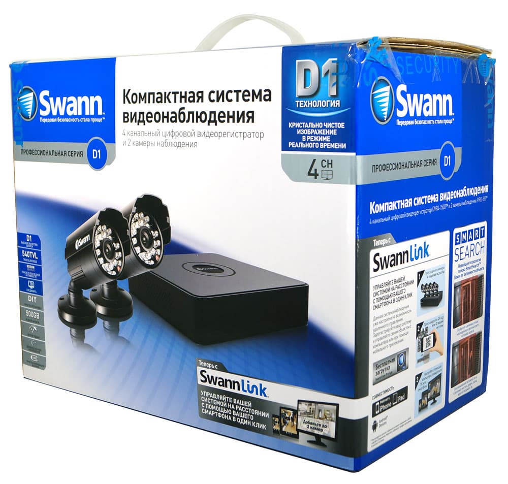 Вся система помещается в коробке средних размеров, снабженной ручкой для переноски. Полиграфия на коробке подробно описывает состав, назначение и функции комплекса. Внутри «главной» коробки обнаруживаются ещё две упаковки, в первой спрятаны камеры Swann Pro-510 с общим блоком питания, а во второй находится сердце комплекса — регистратор. Приступим к вскрытию упаковки, начнем с камер.