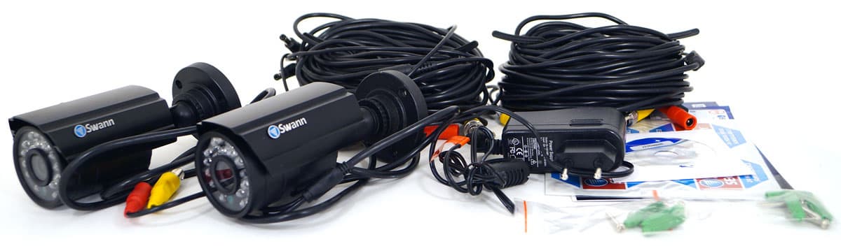 Прилагающиеся две камеры Swann Pro-510 производитель комплектует одним общим сетевым адаптером питания с переходником-разветвителем. Также в комплекте имеются крепежные детали для стационарного размещения камер, краткое руководство по эксплуатации на русском языке, гарантийные талоны и несколько наклеек с надписями, предупреждающими о ведущейся видеосъемке от имени Swann. Но главное — здесь нашлось место для двух мотков кабеля. Каждый имеет длину аж 18 метров, и состоит из кабеля питания и соединенного с ним видеокабеля, по которому передается композитный сигнал с камеры на регистратор. Итого — по две жилы в двух параллельных проводах.