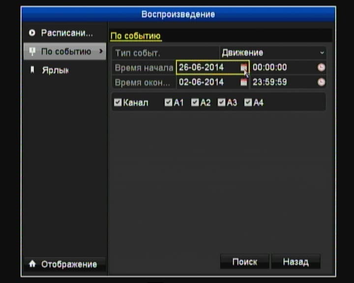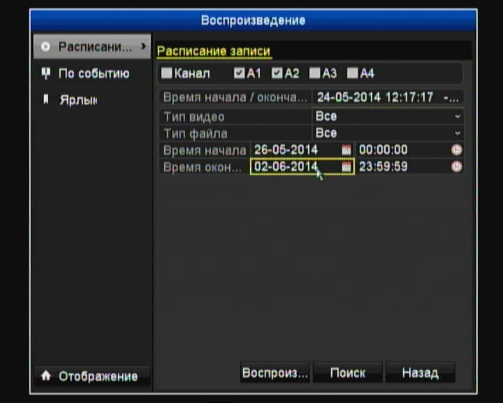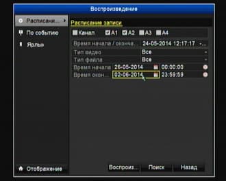 Начнем по порядку. Первая пиктограмма с именем Воспроизведение запускает режим просмотра архива. Здесь можно выбрать метод поиска, задав интересуемый интервал по дате, часам и минутам.