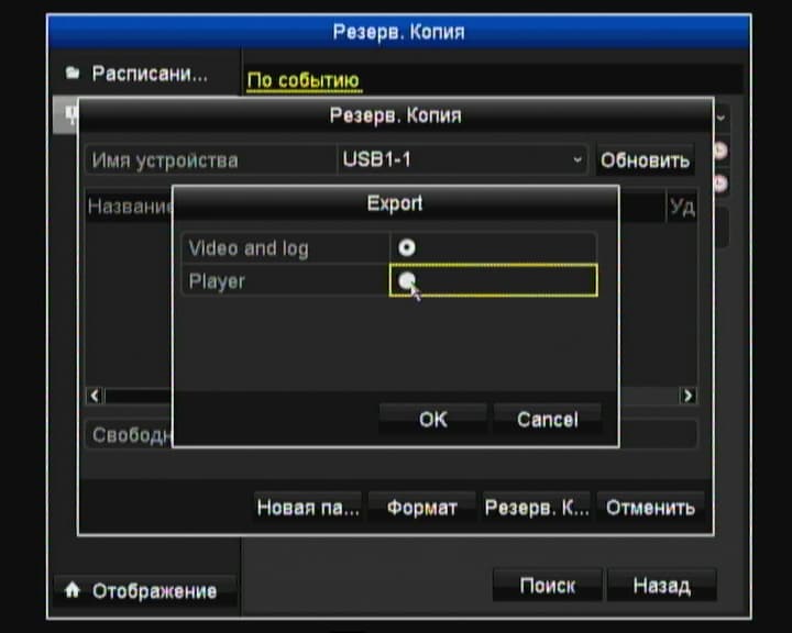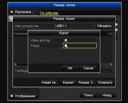 Следующая пиктограмма, Резервная копия, запускает модуль копирования на USB-носитель материала за выбранный отрезок времени. Подключив к свободному USB-порту флэшку, пользователь может скопировать на нее видеоролики, отобранные по какому-либо событию и дате.