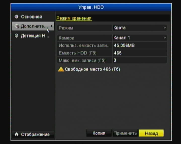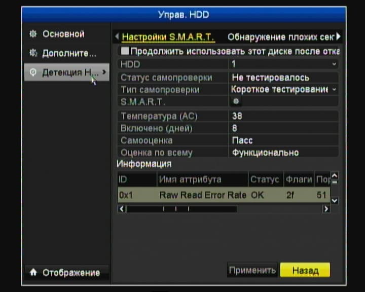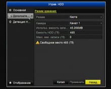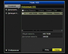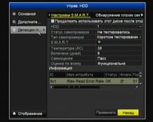 | Просмотр общей и доступной емкости жесткого диска | Определение квоты для каждого видеоканала в отдельности | Просмотр информации о состоянии жесткого диска, тестирование на наличие сбойных секторов |