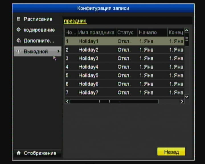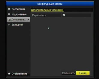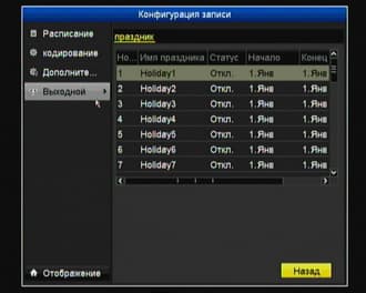 | Активация режима перезаписи — удаления старых записей с целью освобождения места для новых | Настройка выходных дней — в указанные дни запись производиться не будет |