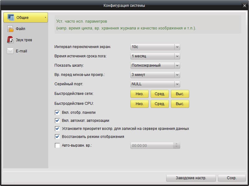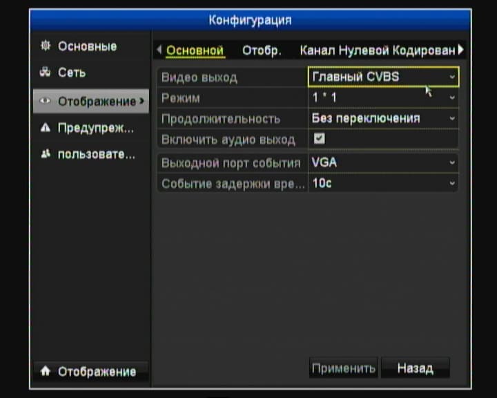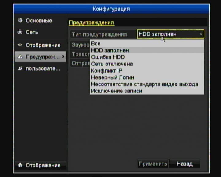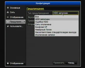 | Выбор основного и дополнительного видеовыходов. Видеовыходы в регистраторе не дублируют друг друга, они независимы. Так, на мониторе, подключенном к регистратору по D-sub, может отображаться текущая картинка с камер. В это же время на телевизоре, подключенном к регистратору по композиту, можно вести поиск событий, изменять системные настройки, или дублировать картинку с камер. | Настройка действий при тревоге (звуковое оповещение, вывод на экран, сообщение по электронной почте). В качестве триггера могут выступать такие события, как переполненность или отказ жесткого диска, отключение сети и прочие сетевые проблемы, попытка входа неавторизованным пользователем и другие |