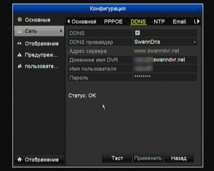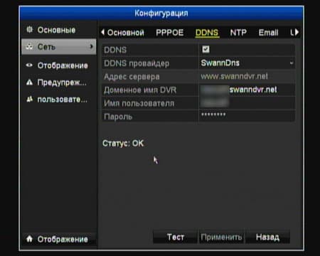 Что касается DDNS — простейшая и быстрая регистрация в фирменном сервисе Swann DNS позволяет получить постоянную «прописку» в Интернете. Для проверки доступности комплекса через данный DNS-сервис в настройках имеется кнопка Test. Минутное раздумье — и на экране появляется вожделенное Статус: ОК! Теперь к вашему комплексу можно «достучаться» из любой точки планеты, даже если провайдер не предоставляет постоянный IP-адрес — достаточно иметь присвоенный вновь созданный адрес ИМЯ_ПОЛЬЗОВАТЕЛЯ.swanndvr.net.