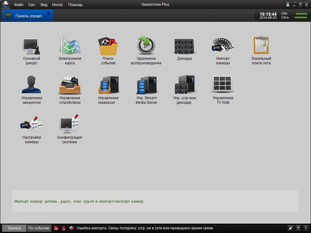 Панель управления данного приложения хранит множество иконок, запускающих соответствующие модули. Например, отсюда можно перейти к просмотру живого видео или архиву с возможностью поиска, в том числе «умного», когда пользователь указывает на экране область, движение в которой следует анализировать.