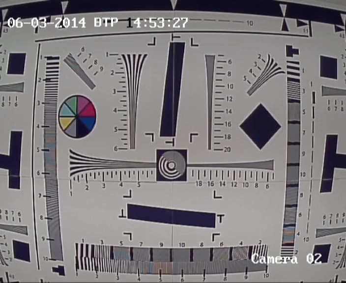 Что касается детализации видео — ну какую детализацию можно требовать от камеры и комплекса, которые — как заявлено в спецификациях — предоставляют лишь 540 телевизионных линий? Более того, эти заявленные линии имеют слабое отношение к действительности. Как, например, не имеют отношения к действительности современные размеры видеокадра. Например, пресловутые 1920×1080. На практике оказывается, что эти размеры отражают всего лишь разрешение кадра, то есть его размер в точках. При этом разрешающая способность камеры — это совершенно иное дело, никак не связанное с маркетинговым обозначением видеоформата. Попытаемся измерить разрешающую способность наших камер, которые подключены к рассматриваемому комплексу. Для этого произведем съемку специальной тестовой таблицы:
