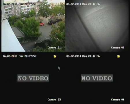 Режима с отображением двух камер в регистраторе не существует: на экране может отображаться либо одна камера, либо сразу четыре. Два канала по понятным причинам у нас отсутствуют, в комплекте ведь только две камеры. Можно видеть, что первая камера, глядящая на улицу, снимает в цвете, в то время как вторая, находящаяся в комнате и повернутая объективом в угол, автоматически перешла в режим ночной съемки.